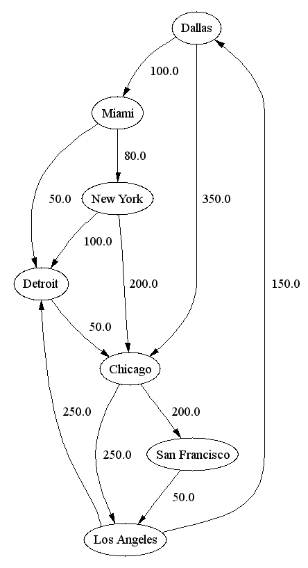 [('Dallas', 0.0), ('Miami', 100.0), ('Detroit', 150.0), ('Chicago', 200.0)]